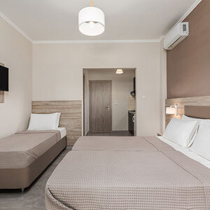 Σε όλα τα δωμάτια μας παρέχονται δορυφορική τηλεόραση, ψυγείο, εξοπλισμένη κουζίνα, προσωπικό μπαλκόνι, air-condition, internet wi-fi.
